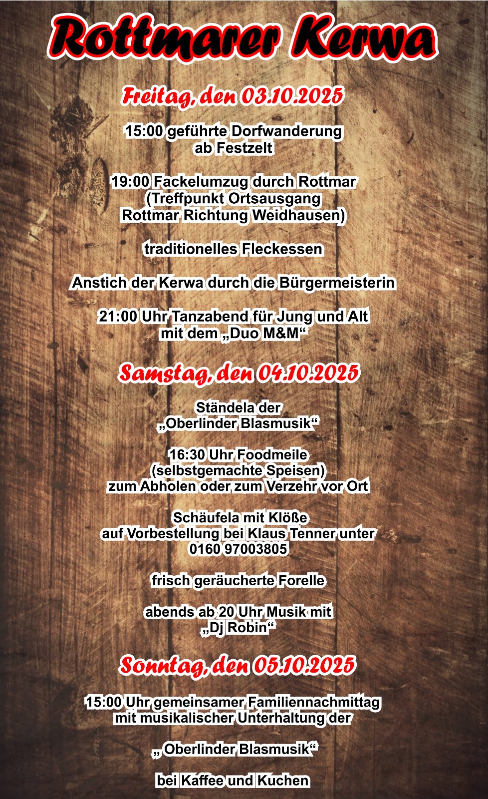 15:00 Uhr geführte Wanderung 19:00 Fackelumzug durch Rottmar Anstich der Kerwa durch die Bürgermeisterin 21:00 Uhr Tanzabend mit "Duo M&M"